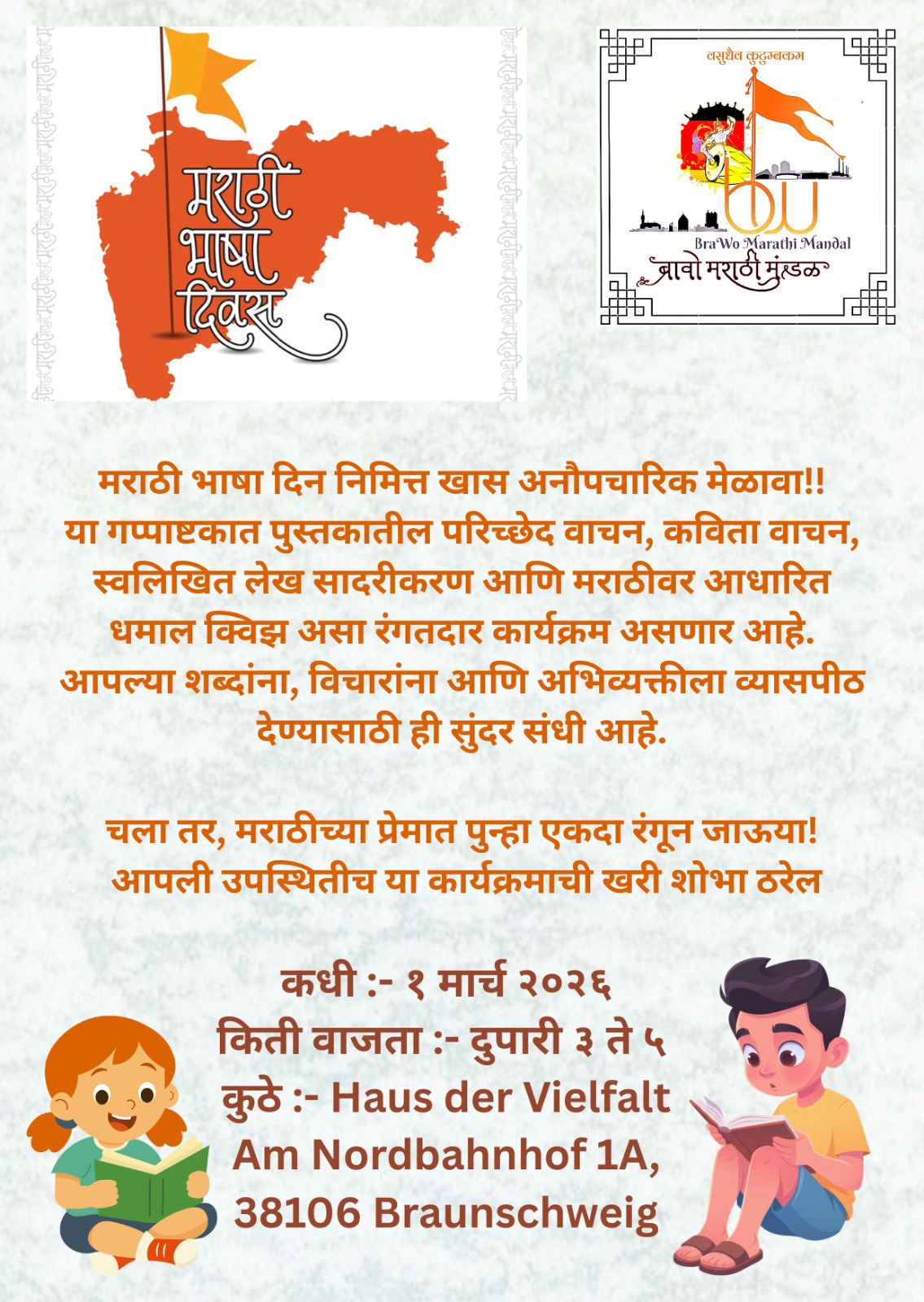 BraWo Marathi Mandal celebrated Marathi Bhasha Din on 1st March 2026. १ मार्च रोजी Haus der Vielfalt येथे मराठी भाषा दिन उत्साहात साजरा करण्यात आला. हा कार्यक्रम मराठी भाषेवर प्रेम…Read More
